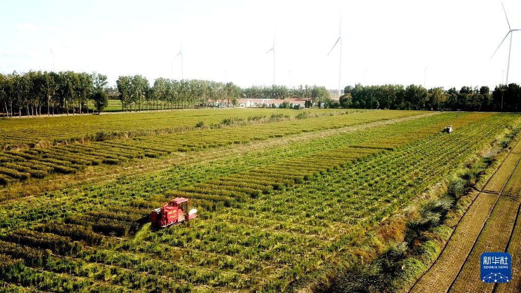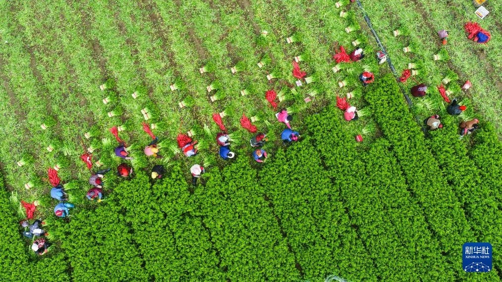 10月23日,农民在山东省东营市广饶县乐安街道一处农田里收割芹菜(无人机照片)。