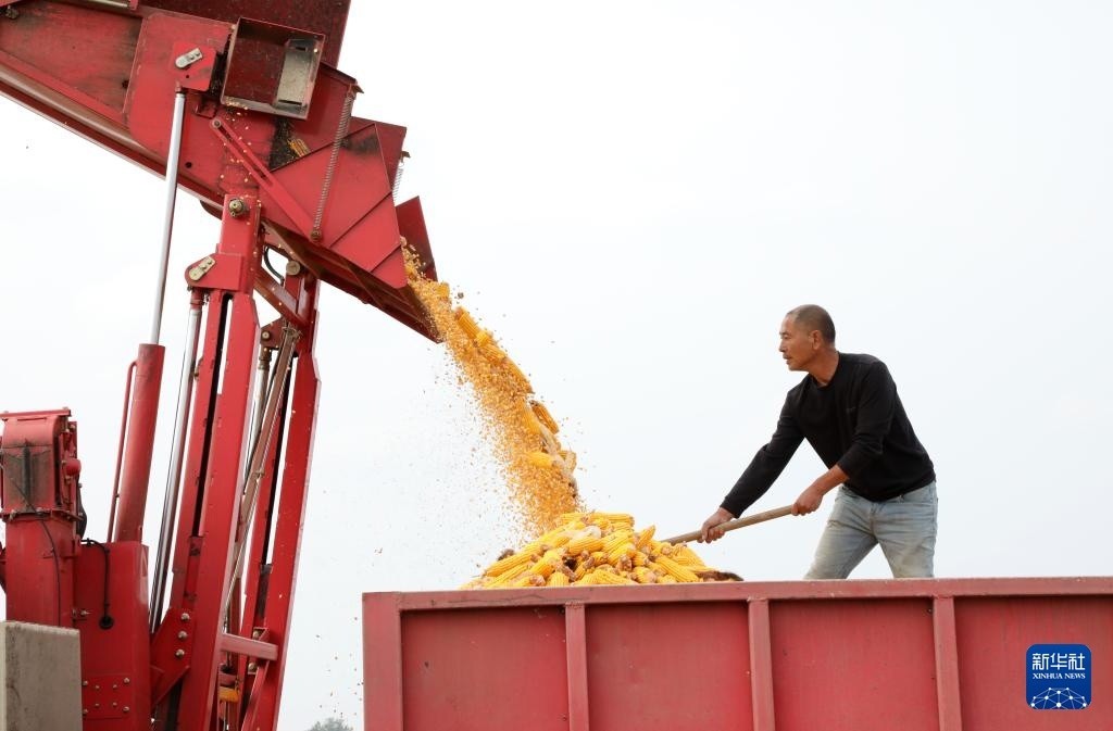 10月23日,农民在山东省滨州市博兴县店子镇刘耿村整理刚收获的玉米。