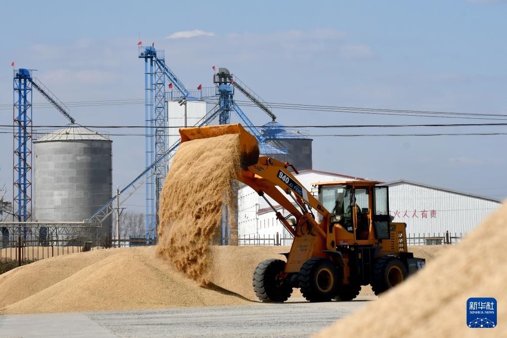 10月23日,铲车在黑龙江北大荒农业股份八五六分公司第六管理区一处晒场翻晒粮食。