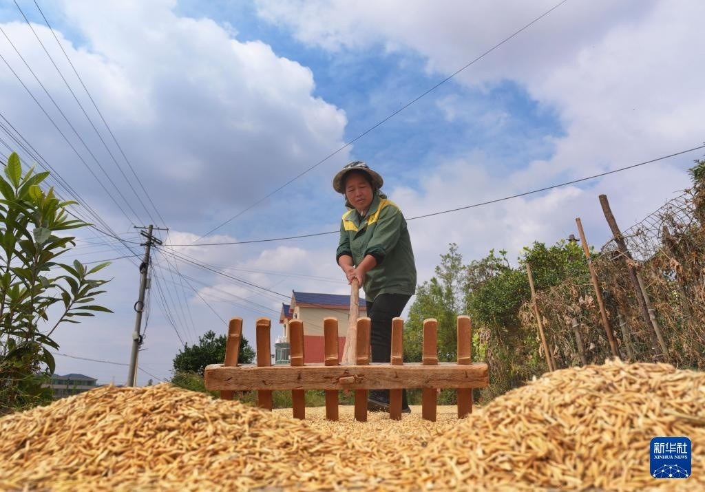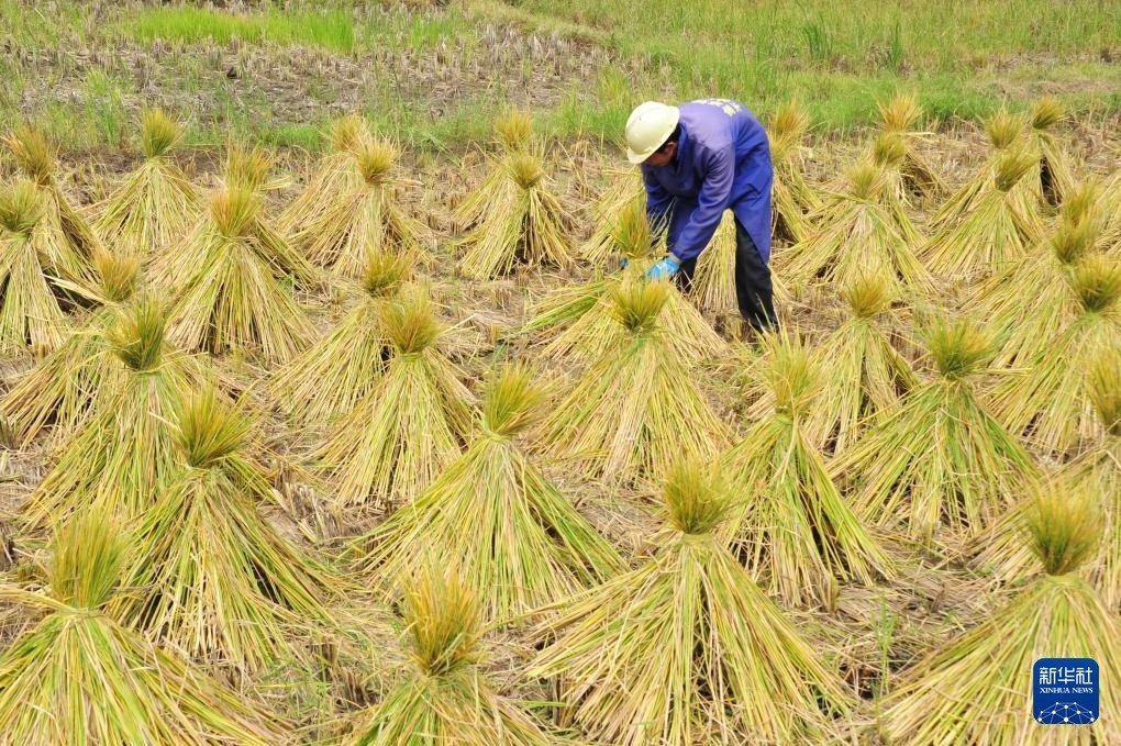 10月23日,农民在广西河池市罗城仫佬族自治县四把镇新印村捆绑禾杆草。