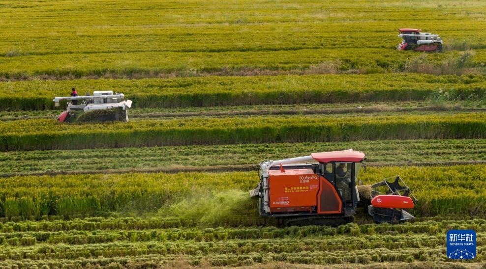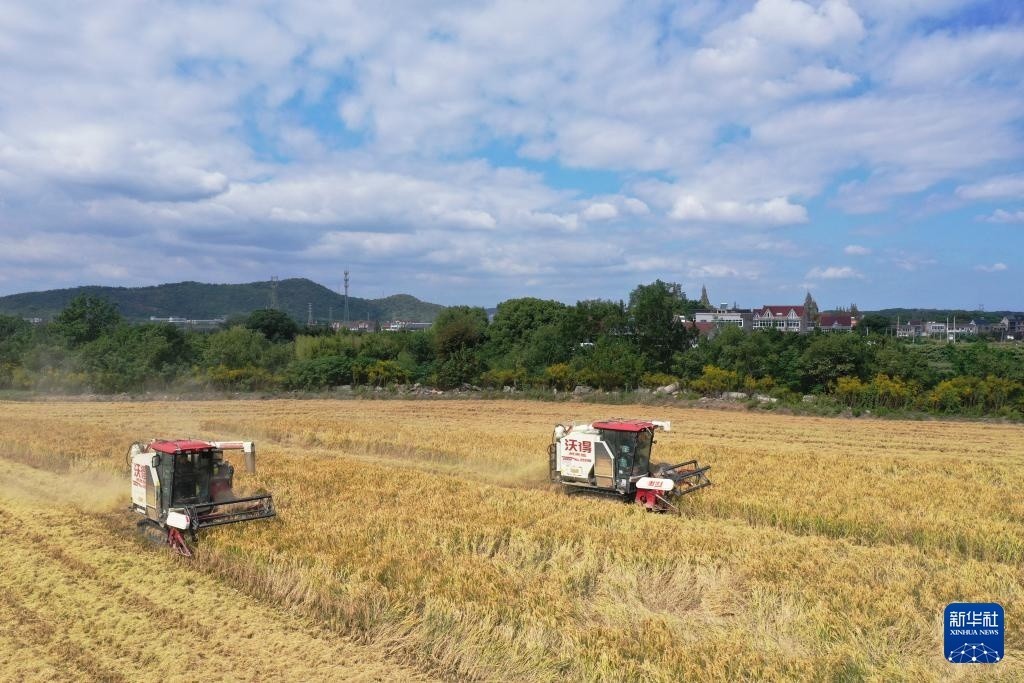 10月23日,农机手驾驶农机在安徽省合肥市蜀山区小庙镇石塘村稻田里收割水稻(无人机照片)。