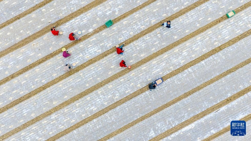 10月23日,农户在河南省商丘市睢县周堂镇齐庄村一处农田种植大蒜(无人机照片)。