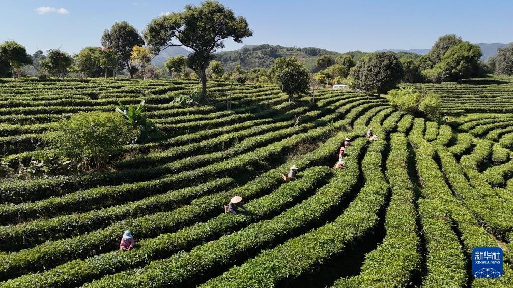 10月23日,茶农在云南省普洱市宁洱哈尼族彝族自治县宁洱镇温泉村采茶(无人机照片)。