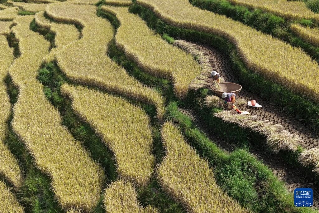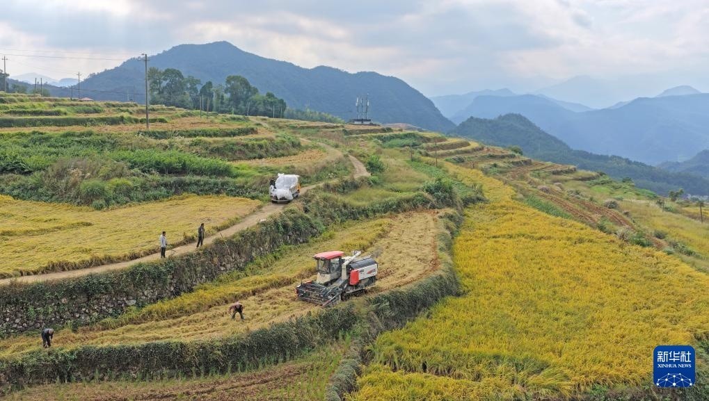 10月23日,农民在浙江省台州市仙居县朱溪镇杨丰山梯田抢收水稻(无人机照片)。