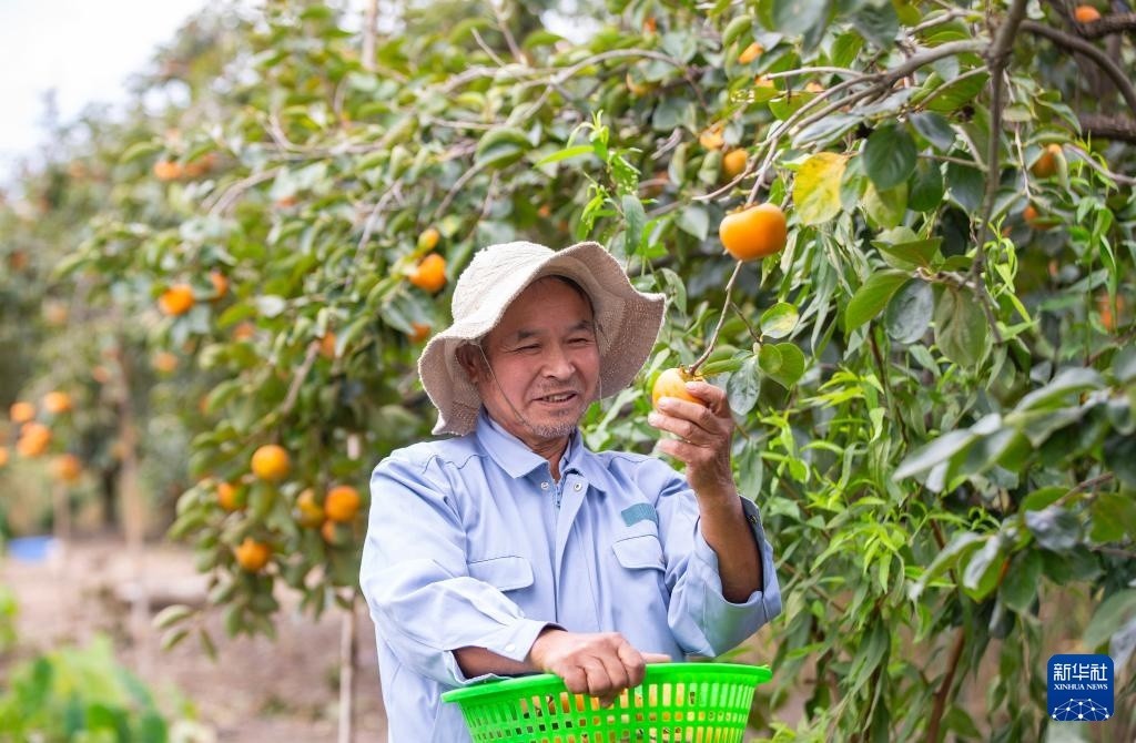 10月23日,江苏省南通市通州区十总镇张沙村村民在采收柿子。
