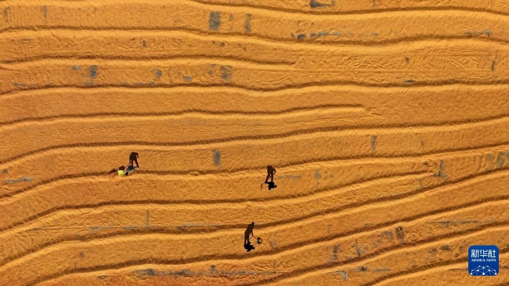 10月23日,农民在湖南省衡阳市衡东县霞流镇晾晒稻谷(无人机照片)。
