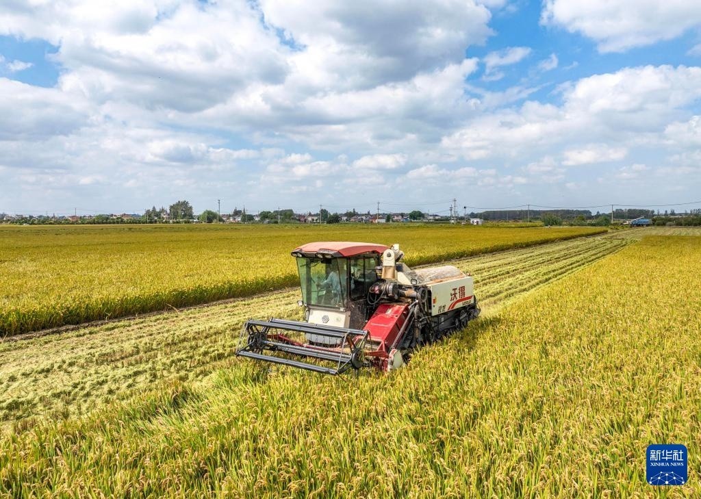 10月23日,农民驾驶收割机在江苏省泰州市海陵区苏陈镇镇东社区收割水稻(无人机照片)。