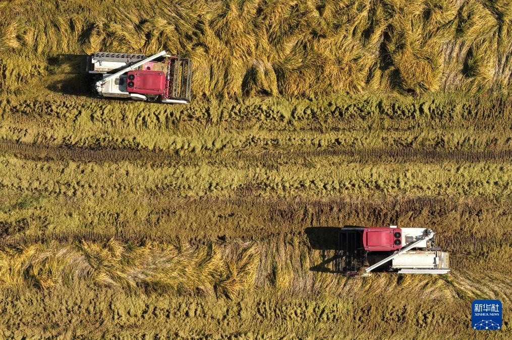 10月23日,收割机在江苏省扬州市邗江区公道镇的稻田里收割水稻(无人机照片)。