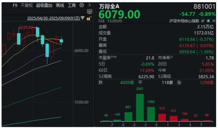 两市超4000只个股下跌,沪深两市成交额2.12万亿元,较上一个交易日缩量3002亿。