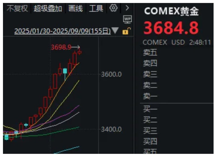 截至发稿,伦敦现货黄金盘中最高涨至约3659.38美元/盎司,COMEX黄金期货最高涨至3698.9美元/盎司。