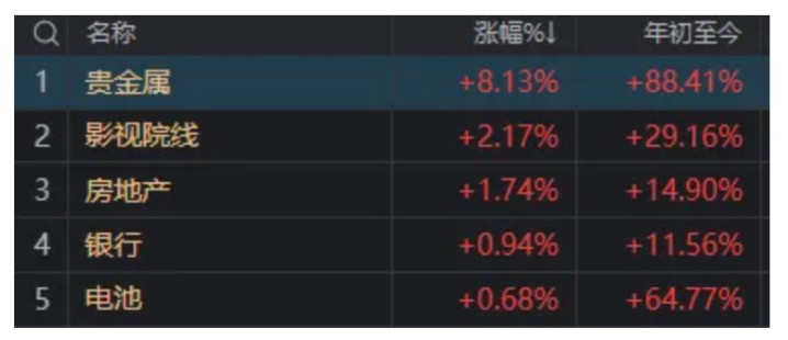 板块方面,今天市场上除了贵金属和固态电池两位“熟面孔”,还多了影视院线与房地产逆势领涨。